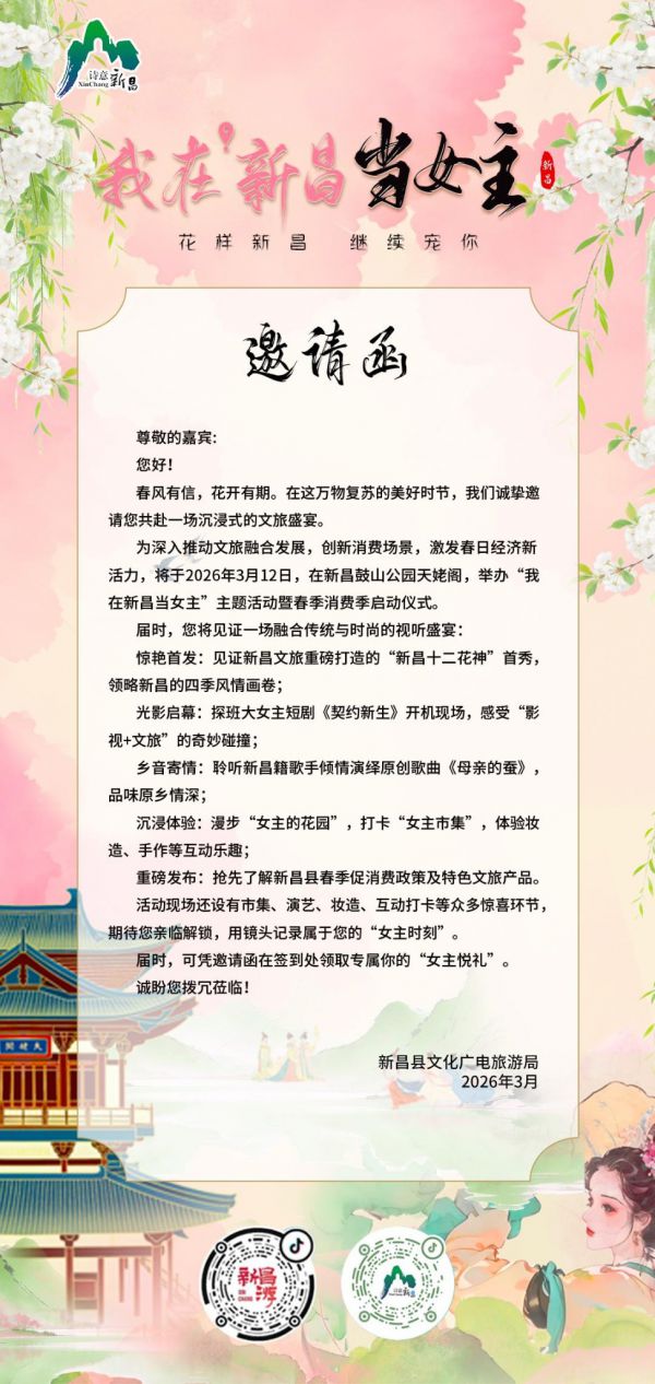 三月新昌,春意盎然。2026年3月12日,新昌县“我在新昌当女主”主题活动暨春季消费季即将在鼓山公园天姥阁精彩启幕,一场集视觉盛宴、沉浸式体验、特色消费于一体的文旅活动,将让新昌市民和游客沉浸式感受家乡的独特魅力,也将向八方来客发出春日的美好邀约。