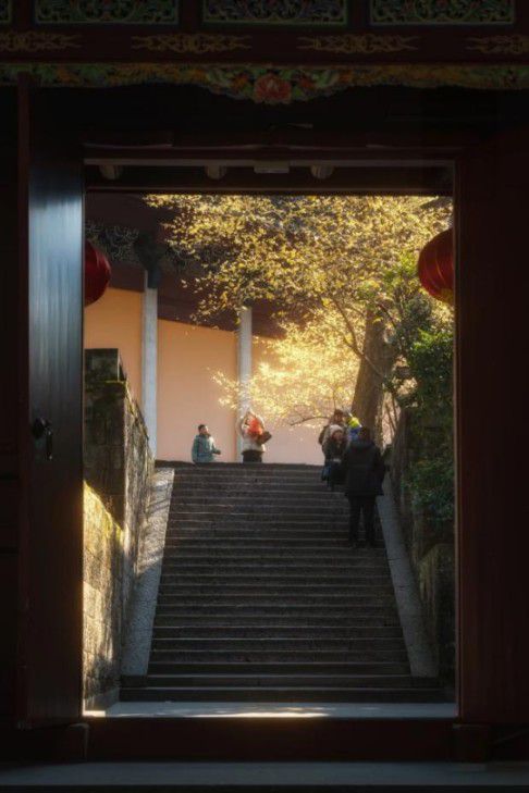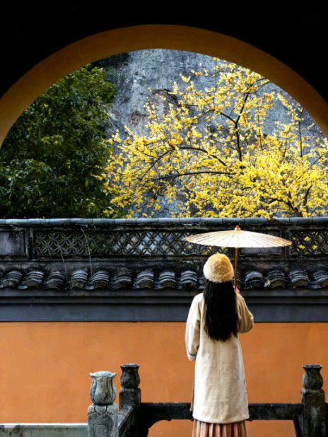 走近了,才真正懂得什么叫 “嗅梅” 。那香气与方才远处闻到的又自不同。清冷的底子里,透出极幽微的甜,是王安石那句“遥知不是雪,为有暗香来”最精准的注脚。这香是有重量的,沉甸甸地往下坠,坠入泥土;又是有魂灵的,袅袅地往上浮,融入檐角的铃铎与断续的经诵里。我忽然想起昨夜读到的句子:“禅心已作沾泥絮,不逐春风上下狂。”眼前这香,可不正是那“沾了泥”的柳絮么?不飘不扬,只固守着一方清寒,静吐芳华。任它身后《周生如故》的戏文在游人耳语里流转,任它身侧《九重紫》的侠影在回廊间被寻觅,它只是它,千年古刹里一株安静的、按时开落的梅。